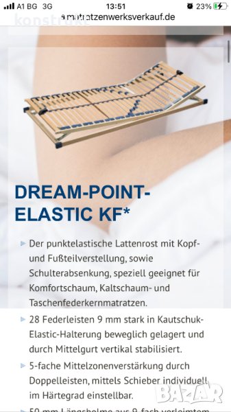 ✔️Точково-еластична ламелна рамка с регулиране на частта за глава и крака, както и спуснати рамене, особено подходяща за матраци с комфортна пяна, студена пяна и матраци с покет пружини.