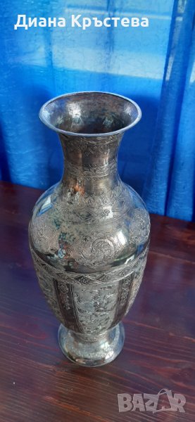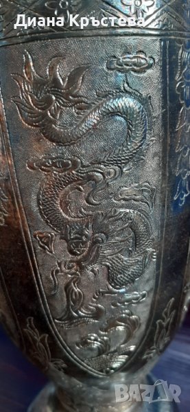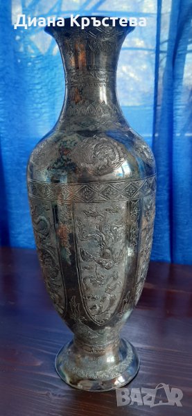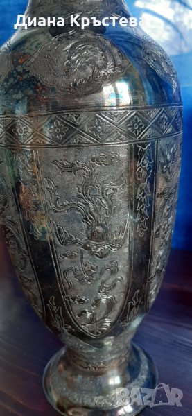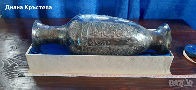 Изключително красива посребрена медна ваза с китайски мотиви. Нова, в кутия.
