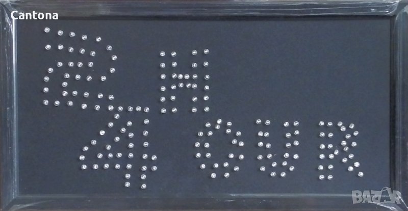 • Светеща (светодиодна LED) рекламна табела с надпис 24 HOUR, синя цифра "2", зелена "4", бели букви"HOUR". Цифрите мигат на интервал 1 секунда.