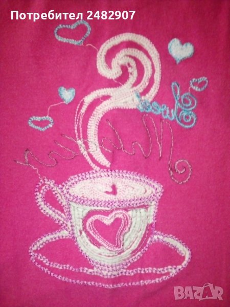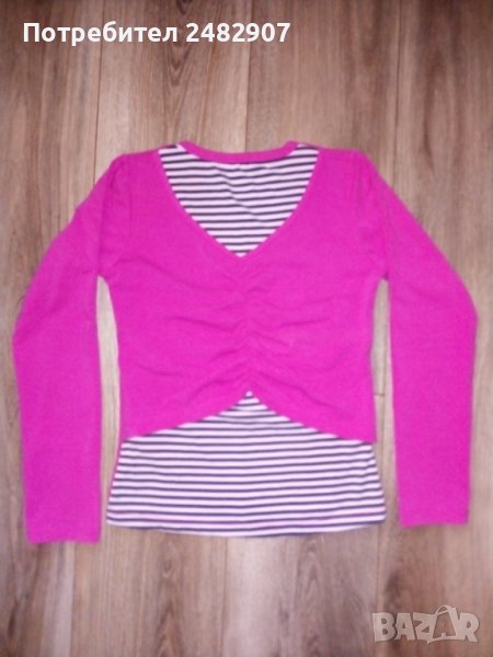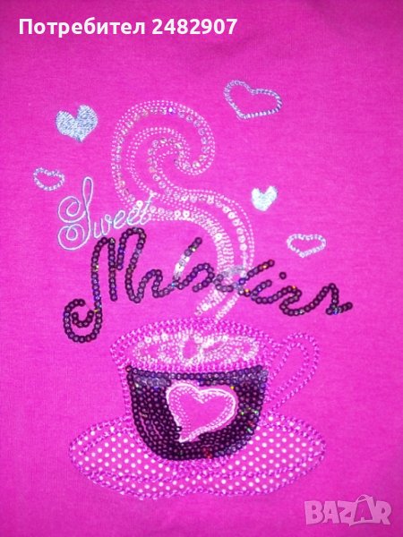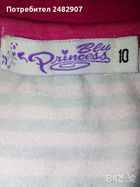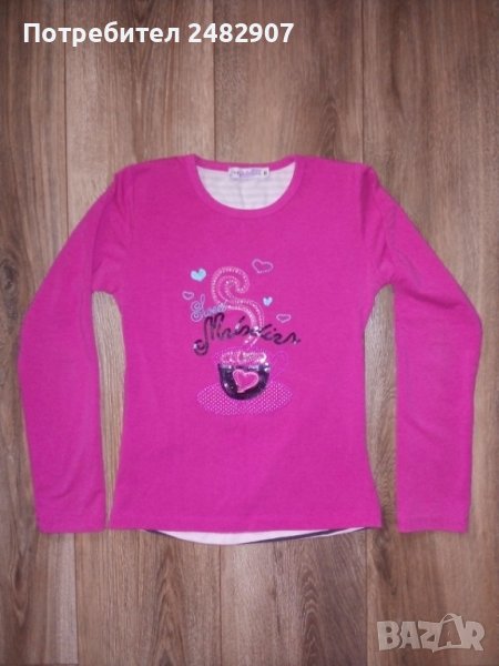 Детска блузка за момиче в розово за възраст - 10 години. Съдържа - 65 % памук, 25 % вискоза и 10 % район. Ширина в раменете - 29 см, ширина под мишниците - 37,5 см, дължина от рамото до долу - 48 см, дължина на ръкава от рамото - 52,5 см. Много запазена, с нормални следи от износване, без забележки.