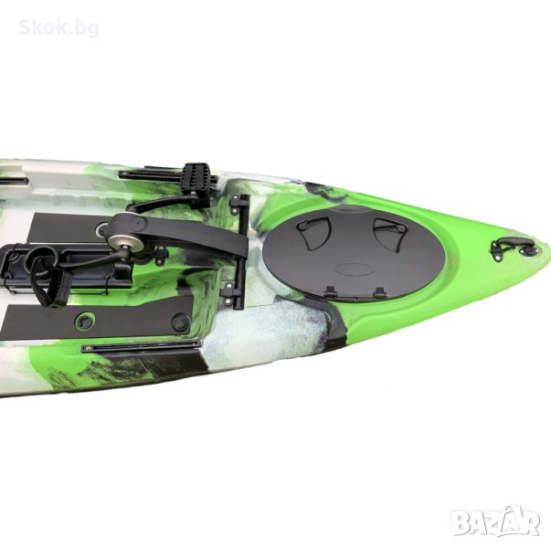 каяк Scorpio Pedal Fish 12 с рамкова седалка и крачно задвижване, предназначен за риболов.