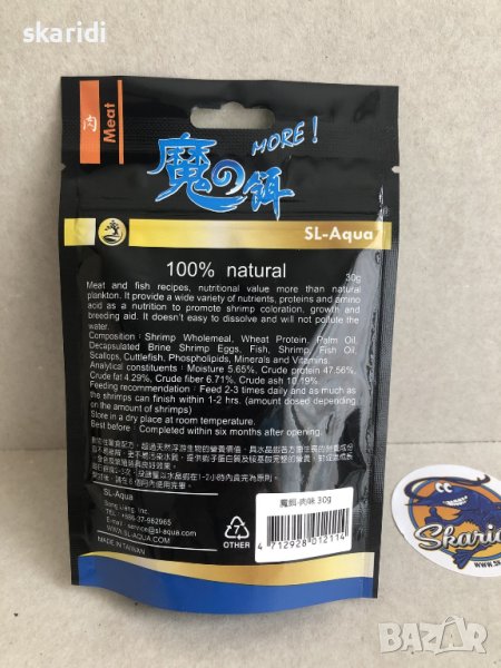 Съдържание и дозировка: 30 грама месни пръчици. SL-Aqua Meat е подходящо за ежедневна употреба и е пълноценна храна за скариди. Хранете толкова, колкото скаридите ядат за около 1 или 2 часа.