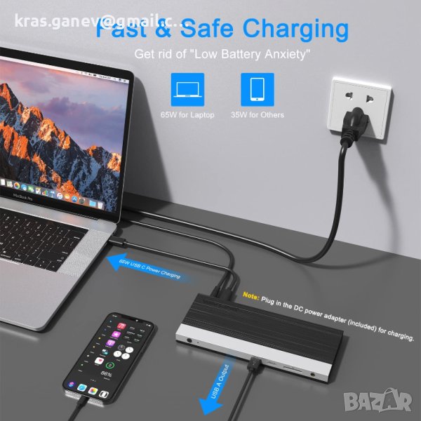 65W зареждане - оставете захранващия си кабел в чантата. Ако вашият лаптоп поддържа USB-C захранване, 65 W зареждането на тази USB-C докинг станция доставя цялата енергия, от която вашият лаптоп се нуждае за вашите продуктивни дейности, като гарантира, че получавате правилното зареждане