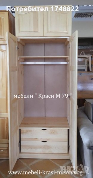 Гардеробът е изработен от масивна иглолистна дървесина, предлага се и на модули.