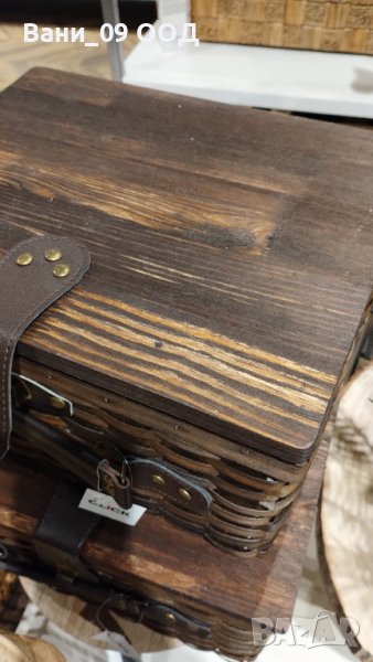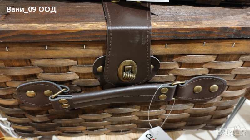 Страхотна кошница за пикник от плетено дърво, със закопчалка и капак от масивно дърво.