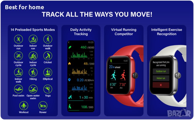 [Целодневен спортен часовник] Octandra Go Smart Bracelet работи като часовник за измерване на пулса, монитор за нивото на кислород SpO2, проследяване на стъпки, часовник за брояч на калории, проследяване на сън и разполага с 14 спортни режима, включително плуване в басейн и открити води, интелигентно разпознаване на упражнения, виртуално бягане състезател и свързани GPS функции. Можете да преглеждате вашите дневни, седмични, месечни и годишни данни за здравето и активността в приложението с изчерпателен анализ, включително здравни тенденции, за да коригирате вашите фитнес цели!