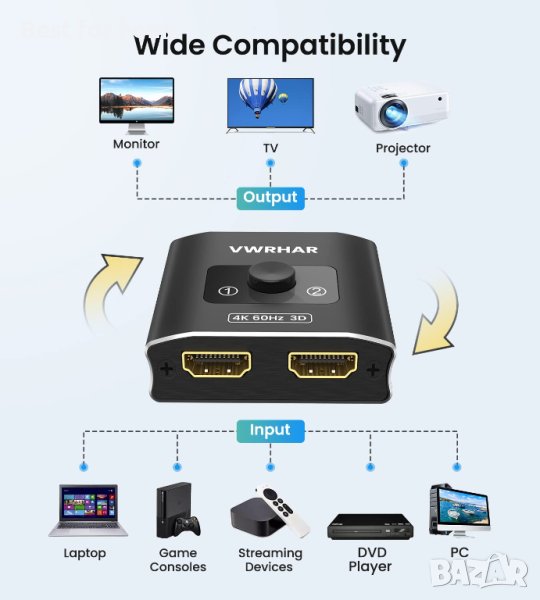 【ШИРОКА СЪВМЕСТИМОСТ】Този пасивен превключвател HDMI 2.0 е подходящ за повечето устройства със стандартен HDMI интерфейс. Вход: Xbox 360, Xbox One, PS3 / PS4/PS5, игрови конзоли Nintendo Switch, компютър, Blu-Ray DVD плейър, Route Roku, Chromecast, Firestick, кабелна кутия, Apple TV, компютър и др. Изход: HD-Ready, Full HD, UHD телевизори, монитори, проектори и др.