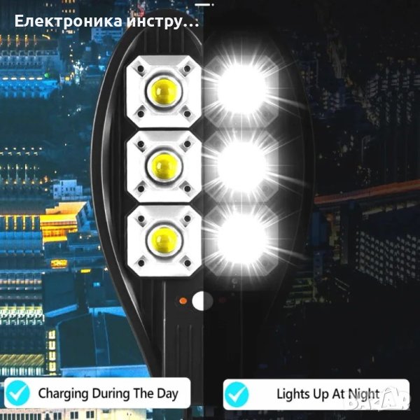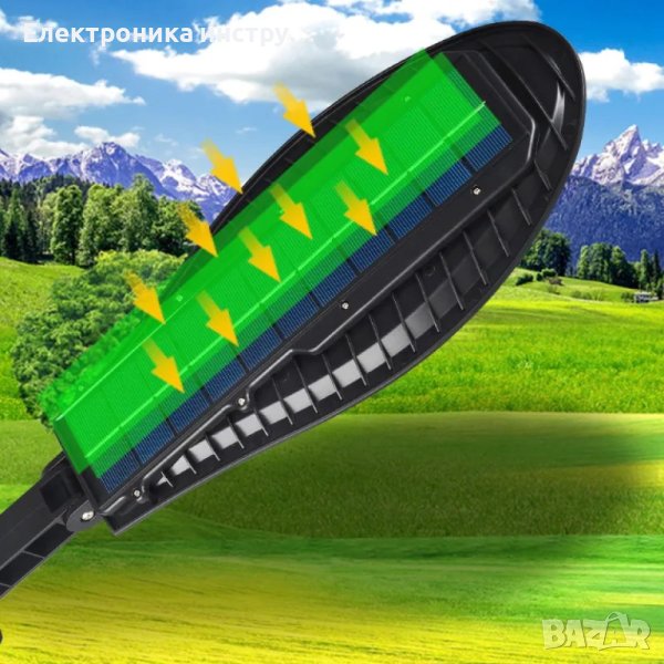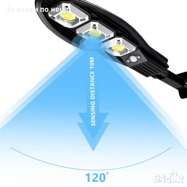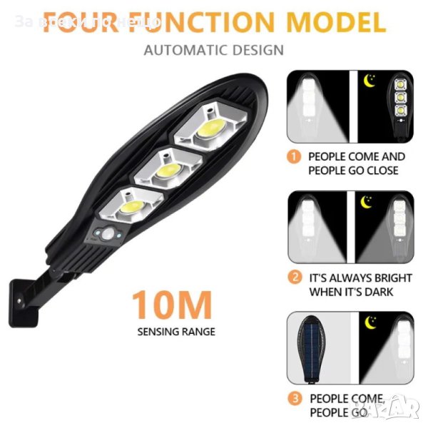 Системата е изцяло автономна, през светлата част на деня се зарежда батерията, а веднага след като се стъмни осветлението се включва автоматично, благодарение на сензорите които са в соларния панел. Соларната улична лампа е интелигентна система за външно осветление, която интегрира най-добрите енергоспестяващи части – фотоволтаичен панел, осветително тяло, сензор, контролер и литиева батерия, всичко това в една кутия. През деня високоефективният слънчев панел събира енергия от слънцето и я съхранява в усъвършенстваната литиева батерия. През нощта мощният светодиод автоматично ще се включи, за да осигури светлина. Опция за светене когато се установи движение, COB ще увеличи яркостта, за да осигури изобилие от допълнително осветление за всеки в района. След 20-30 секунди или когато движението вече не е открито, светлината ще се изключи, за да спести енергия. Тази интелигентна функция позволява на соларната лампа, захранвана от слънчева енергия, да спестява енергия, когато никой не е в обхват и няма необходимост от светлината, което означава много по-дълго време на работа, отколкото бихте очаквали от подобно соларно осветление.