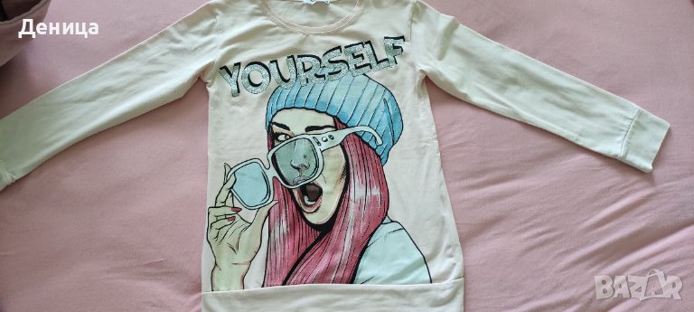 11. Тънка бяла блуза с дълъг ръкав с надписи, цена 4 лв.