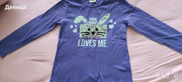 13. Тънка лилава блуза със зайче от обръщащи се пайети, дълъг ръкав, цена 4 лв.