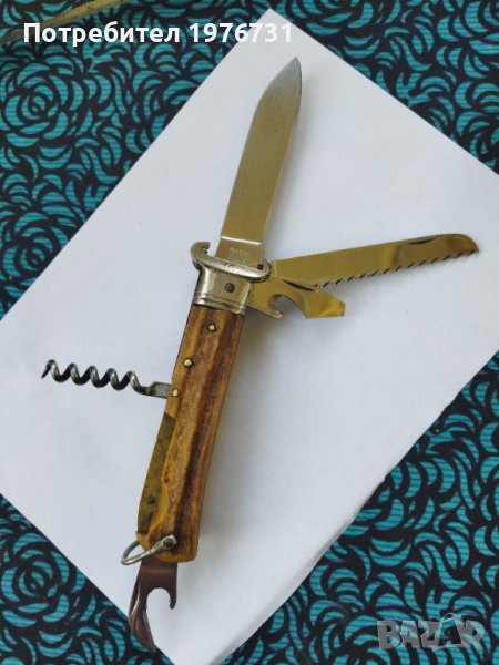 Ножа е здрав стегнат, отлично запазен за годините си 60-70 г. на 20 век. Чирени от еленов рог. Дебелина на дръжката 25 мм. на острието и триона 2.5 мм. Разгледайте внимателно снимките те онагледяват всичко. Без никакви забележки.