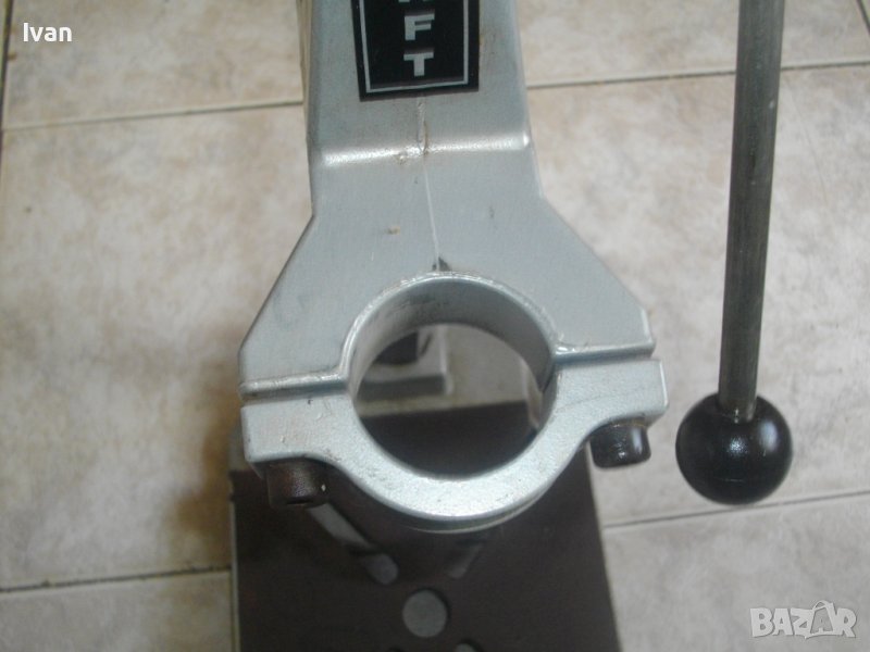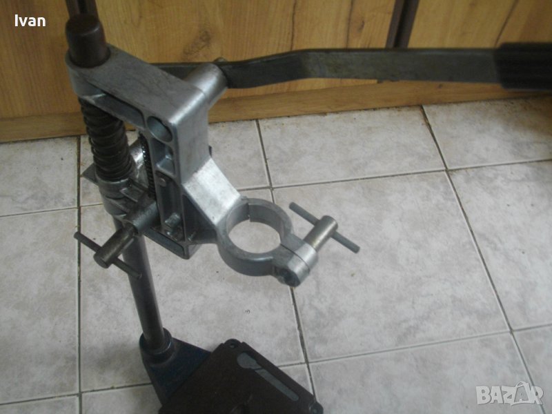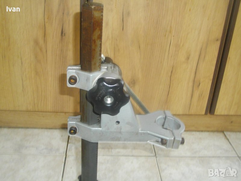 Дебела оребрена тръха плътна ф 30 мм. за придвижване на височината и хода. Две масивни врътки бакелитови за регулация ход. Глава - алуминиева с кръг универсален размер за захват на бормашина ф 43 мм. Тегло на стойката - 8,0 кг. Цена 199 лв.