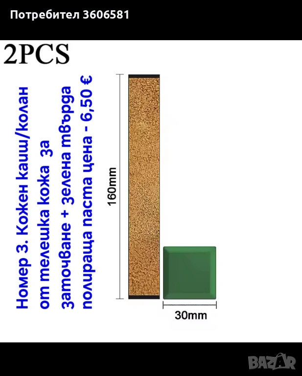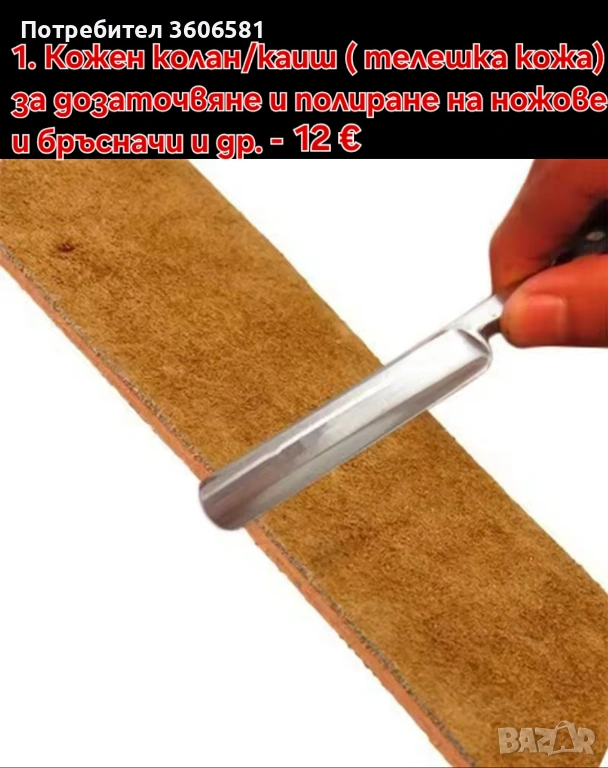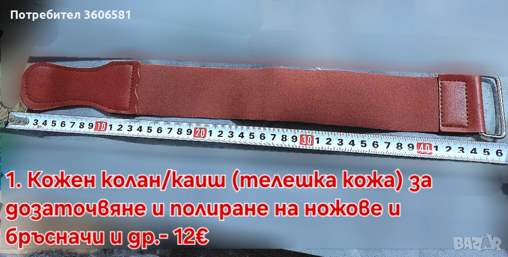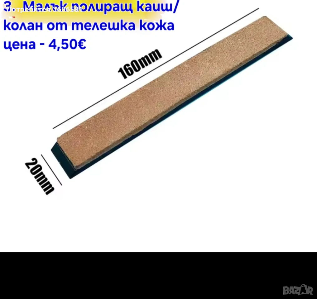 Номер 3. Малък полиращ, дозаточващ каиш/колан от телешка кожа за дозаточване и огледално заостряне на ножове, бръсначи, ножици и др. след като сте ги заточили с водните камъни за заточване, за финалното заостряне след което за да бръснат се прави с кожения колан.