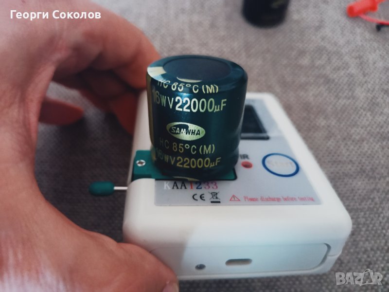 Ценно на моделът е, че мери двойни диоди (трикракови)!!! Което не можете да измерите с обикновен тестер. Освен това мери много големи стойности капацитет (показал съм реално на снимките). Евтините подобни тестери изобщо не мерят повече от няколко стотин микрофарада. Виждате на снимките най-големият, който имам 22000uF (22mF), като уреда мери и до 40000uF, но нямам повече от 22000, за да опитам. Тествал съм 22000, и съм показал на снимките.