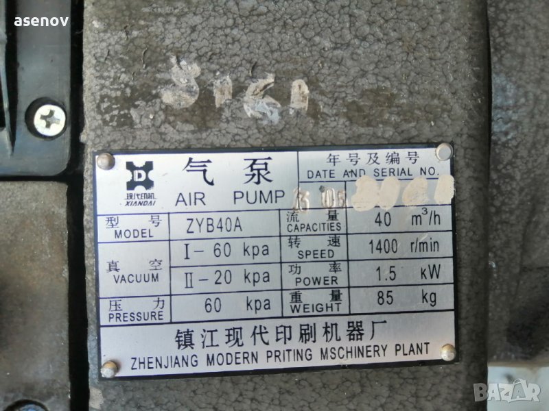Продавам вакуум помпа с мощност 1,5 киловата, 1400 оборота в минута, тегло 85 килограма, 40 кубични метра на час - вакуум