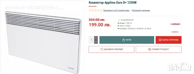 Електрическият конвектор Euro D+ е с електронен терморегулатор с прецизност 0,1 °С, което прави уреда много по-икономичен от стандартните конвектори с механичен терморегулатор. Уредът е снабден с цифров дисплей за визуализация на температурата (от 7 до 27 градуса). Има 3 основни режима на работа: Комфорт, Еко и Против замръзване. Конвекторите Applimo работят на принципа на естествената конвекция и създават уют и комфорт в дома. Със специално алуминиево съпротивление, те са абсолютно безшумни и много надеждни. Щепселът е включен в монтажния комплект и клиентът трябва да си го свърже сам или с помощта на ел. техник.