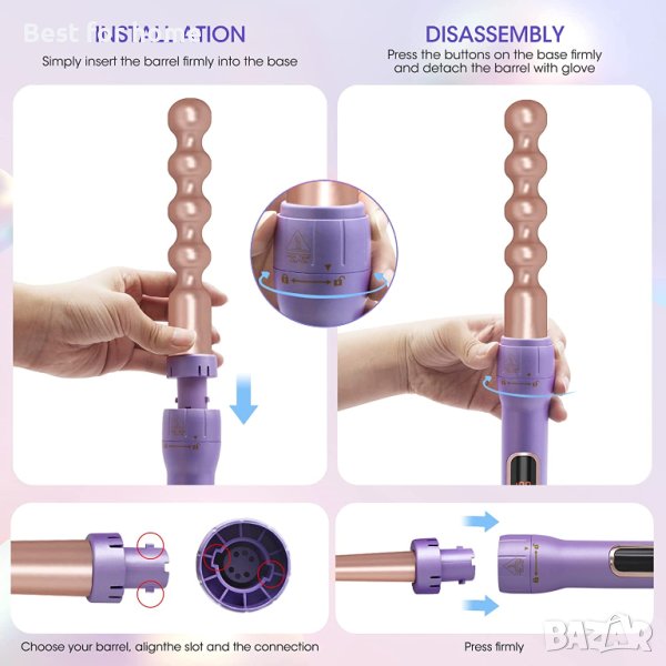 【Автоматично изключване и безопасно оформяне】 Машата за коса ще се изключи автоматично, след като не е използвана в продължение на 60 минути, което може да избегне непрекъсната работа и да повреди работния плот. Дизайнът против изгаряне и бутонът за отваряне на ключалката са по-лесни за поставяне и изваждане на всички варели, като се фиксират по-здраво. Изолираната ръкавица може да предотврати изгаряния.