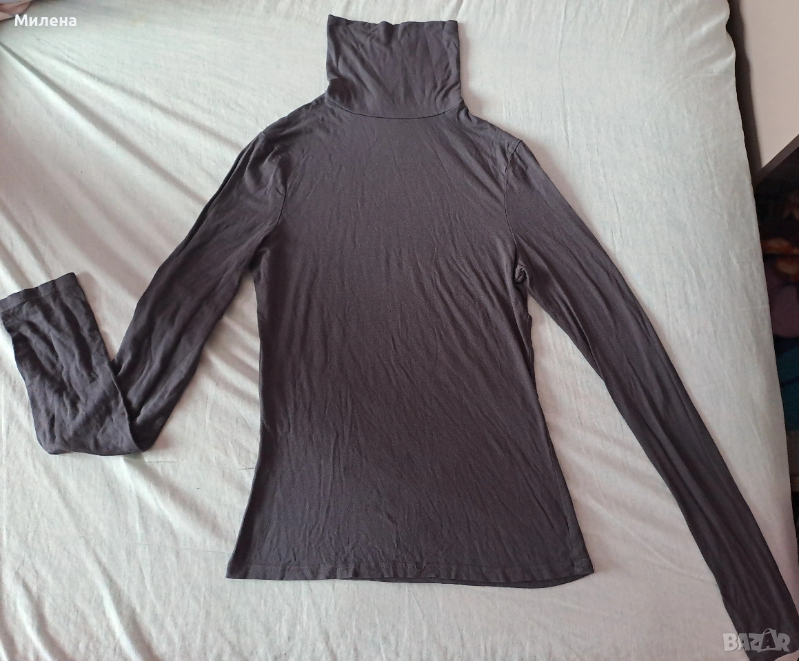 Тъмно-сива тънка блуза поло, размер Xs, бюст измерен едностранно 33 см., дължина 55 см. Цена 1,50 евро.