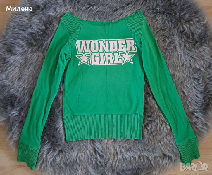 Зелена блуза, размер Xs, с паднали рамене, дължина 49 см., бюст едностранно 33 см. Цена 1,50 евро.