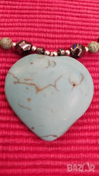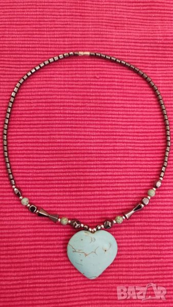 Колие, огърлица, гердан, от магнитен хематит със сърце от тюркуаз. → Обява 40804407