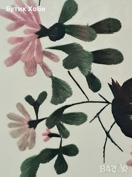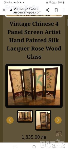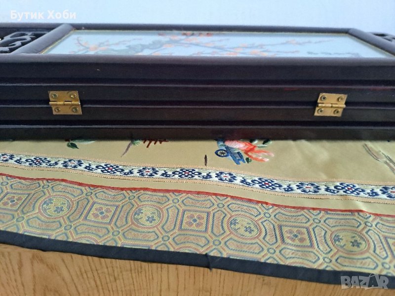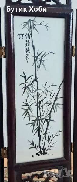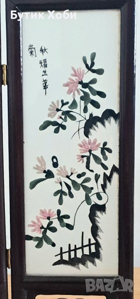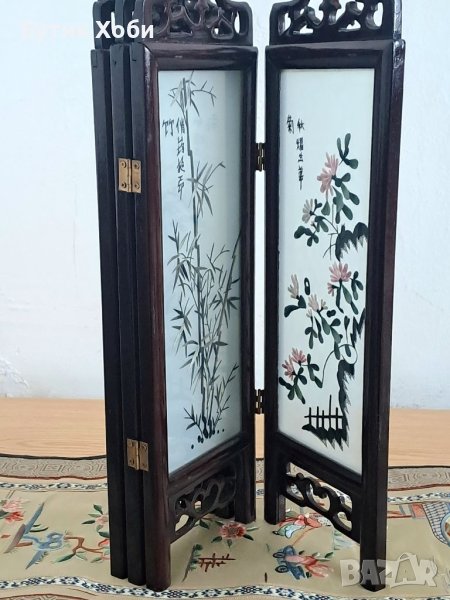 Страхотен декоративен мини- параван, експортен Китай. Рамка е изработена от розово дърво ( Rose Wood). Панелите са ръчна двустранна бродерия с коприна. В перфектно ( ново) състояние, оригинална кутия ( има забележки само по вътрешната и част. Размери- 12,5 ×38, общо 38см дължина.