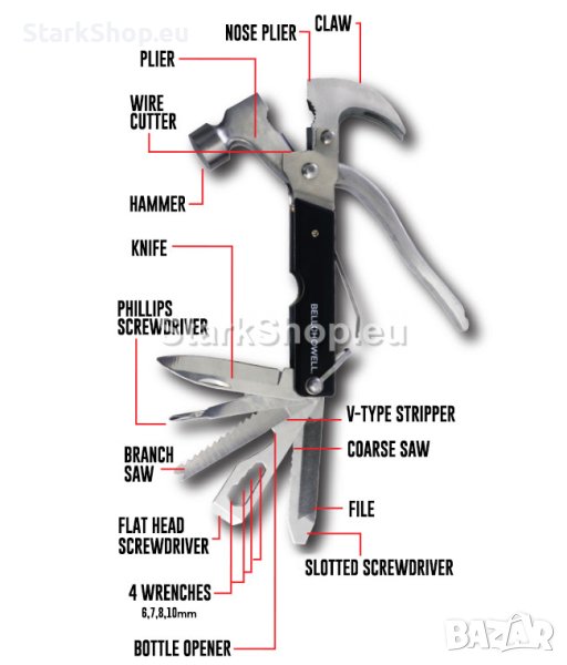 Мултифункционален инструмент 18в1 Tactool е изключително подходящ избор за дребни ремонти у дома. Моделът, който ви представяме е незаменим помощник за всеки любител майстор или при спешна нужда от няколко инструмента под ръка в гаража, колата, на къмпинг, излет и т.н. Благодарение на него ще имате кози крак, клещи, клещи за рязане на кабели, чук, нож, кръстата отвертка, трион, отвертка с плоска глава, 4 ключа (6, 7, 8 и 10 мм), отварачка, обикновена отвертка, пила, трион, тесла и други. Разполага с удобна ръкохватка и изненадващо компактни размери.