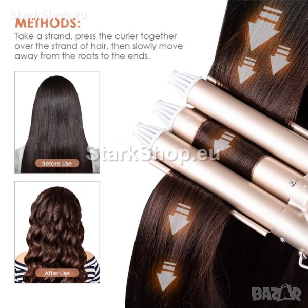 Професионалната тройната ретро преса за коса е чудесен уред с удобна дръжка, с който можете лесно да създавате небрежни, свободни, красиви и професионално изглеждащи къдрици във формата на „S“, които издържат цял ден. Подходяща е за всякакъв тип коса – независимо дали имате къса или дълга, гъста или тънка коса. Машата образува отрицателни йони, които създават меки, блестящи букли без никакво наелектризиране.