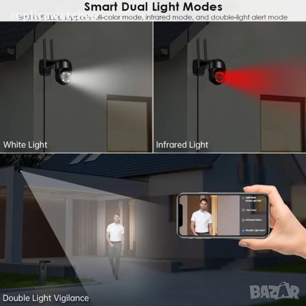 8мегапиксела резолюция, две лещи 2.8 и 12мм, подръжка на 5гигахерцова мрежа, 270° по хоризонтала и 100° по вертикала въртене, работи с icsee и xmeye
