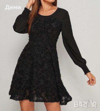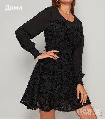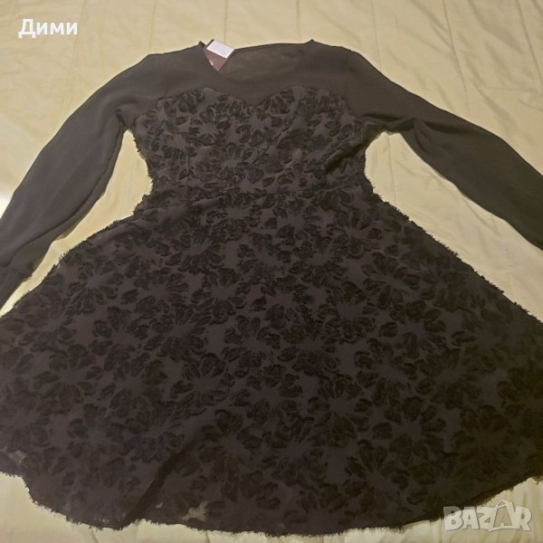 роклята е изработена от мрежеста материя с плътни цветя от малки реснички.Ръкавите и областта на раменете са изработени от шифон. Маншетите са направени от широк ластик. Закопчаването е странично със скрит цип. Хастарът обхваща предната част на роклята и цялата област на ханша. Нова с етикет. Размери бюст-90 талия 74 дължина 90 дължина на ръкав 61см. Стои невероятно!