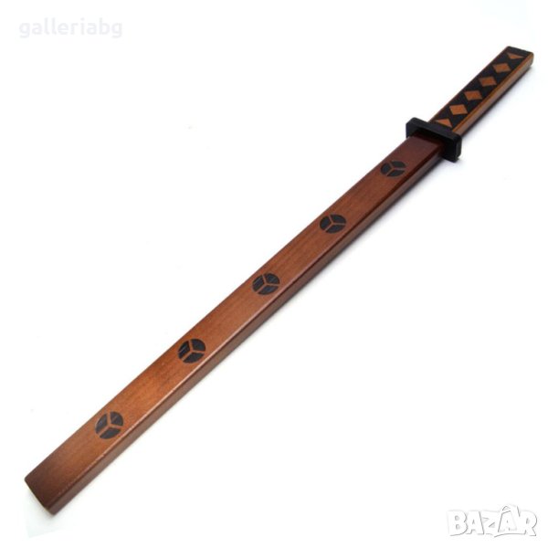 Дървен меч с кания, декориран с черни кръгове със символ.