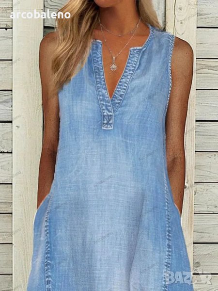 Нова дамска едноцветна широка дънкова рокля без ръкави с V-образно деколте