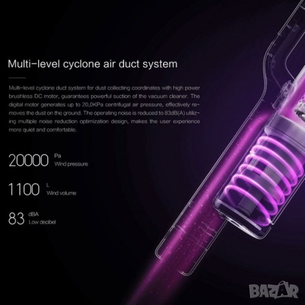 Има DC мотор с мощност 415W и 100.000 об/мин, за бързо почистване. Циклонната многоетапна структура за събиране координира работата с двигателя за изключителни резултати. В режим enhanced, обемът на въздуха достига 1,100 л/мин, докато издаваният шум е само 75dB(A). Roidmi F8 има четири филтриращи системи, за улавяне на коса и прах до алергени и частици от 0,3 μm. С усъвършенстваните функции за елиминиране на бактериите, прахосмукачката осигурява чист и хигиеничен дом.