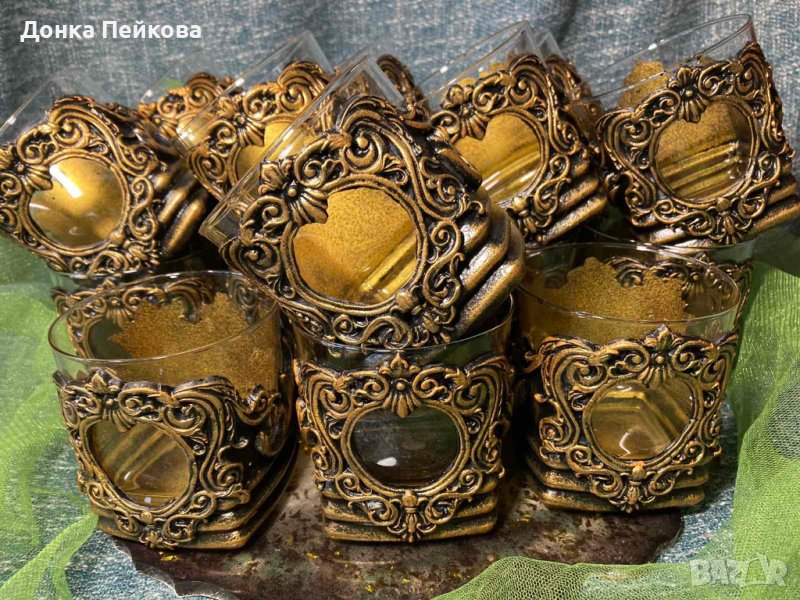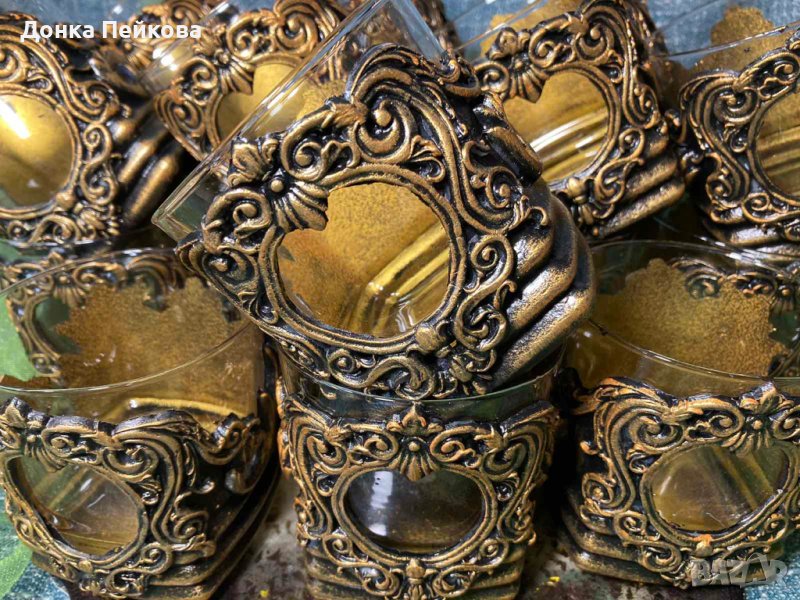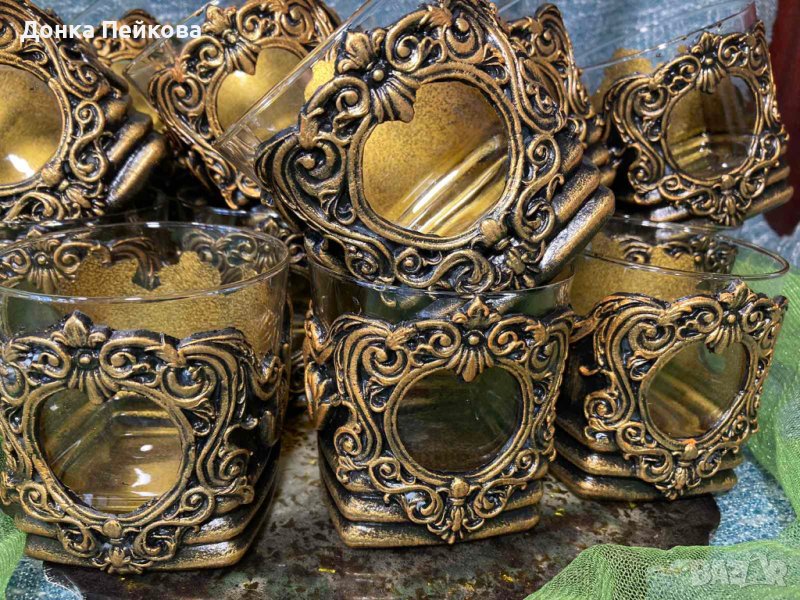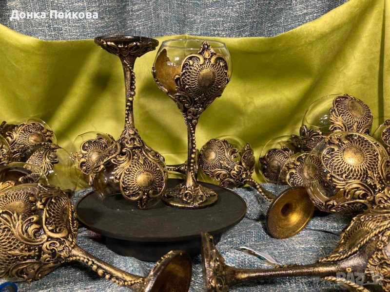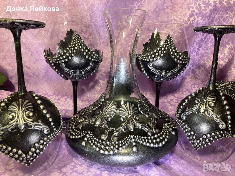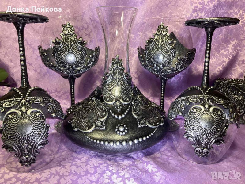 с имитация на сребро или злато - един впечатляващ подарък за годишнина, за Рожден Ден, за абитуриентска, за сватба, за юбилей. Подарък с който гарантирано ще впечатлите всички! Комплекта е единствен и няма да има друг такъв, което го прави уникален. Съдържа деканкер за вино и шест чаши.