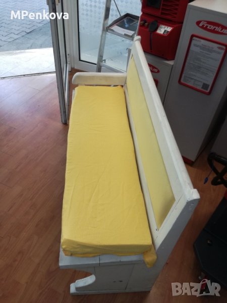 Разполагаме с две дървени масивни пейки. Дължина 120 см. Височина на облегалката 80см. Височина на седалка 45см. Дълбочина на седалка 45см. Налични са със резедаво /между жълто и зелено/ и червен цвят дунапренови възглавници.