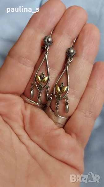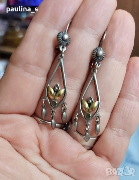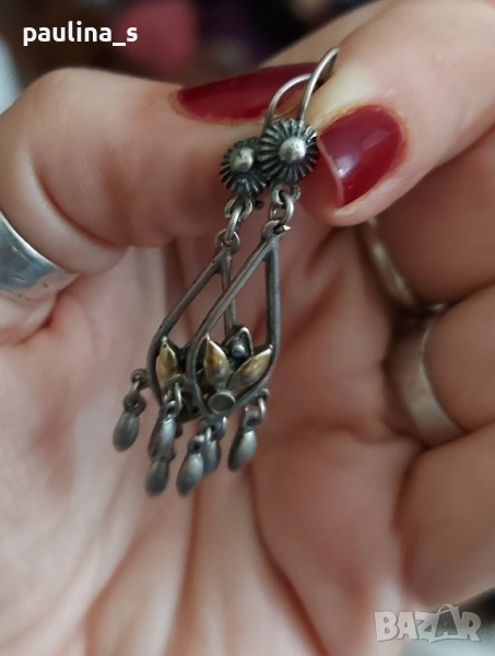 сребърни обеци със златни елементи. Цената е крайна, без пазарлъци 69,99лв / 35 евро. Винтидж семейни сребърни обеци със златни елементи, маркировки 925 и за злато 9к. Мащабирането(Дължината) е на дланта, произход Триполи Либия, не знам какво производство са и двата чифта, не се продават на грамаж, не питайте колко грама са!