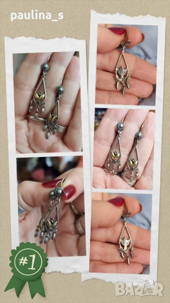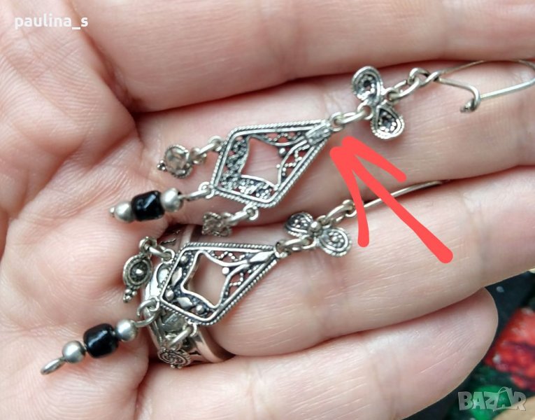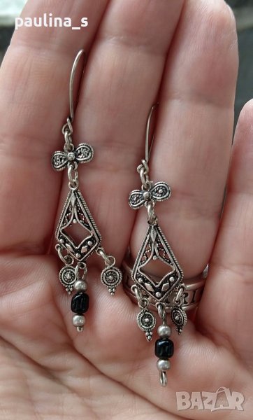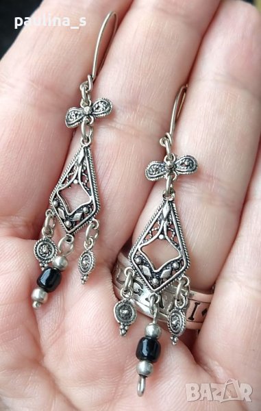 1️⃣. Колаж / Винтидж семейни сребърни. Цената е крайна, без пазарлъци 69,99лв / 35 евро. Семейни винтидж обеци в етно стил, техника филигран, с висящи елементи и естествени мъниста от оникс. Имат съответната маркировка, не се продават на грамаж, не питайте колко грама са! Уникатчета! Стопанисвани с грижа, във вид, видим от снимките, много ефектни - получавала съм много комплименти с тях, мащабирането е на дланта.