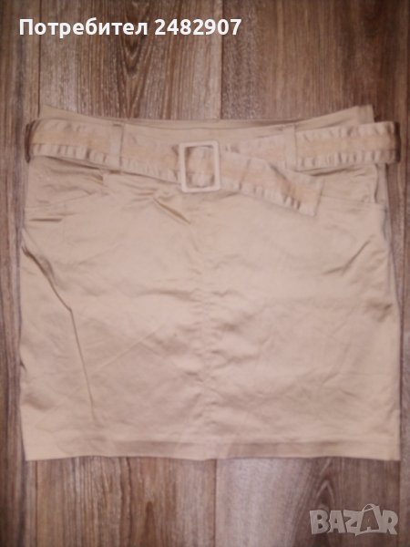 Бежова къса пола с два джоба отпред и колан, размер 32. Съдържа 97 % памук и 3 % еластан. Ширина в талията - 35 см, дължина от талията до долу - 36 см, закопчаване - със скрит английски цип от лявата страна. Много запазена, почти не е използвана, със забележка - кафява точица отпред.