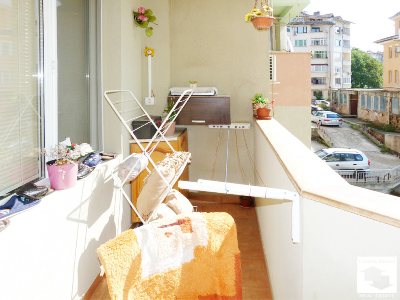 Интериорът е с подови настилки от ламинат и теракот, PVC дограма и MDF врати. Жилището се продава частично обзаведено и в отлично състояние, с външна изолация и източно изложение.