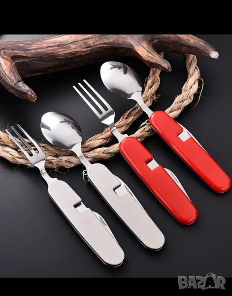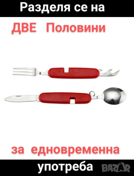 Удобен за всяко пътуване мултифункционален инструмент -нож , вилица, лъжица и 2 отварачки- за бутилки и консерви. Разделя се през средата така, че да се ползват различни комбинации с двете ръце.