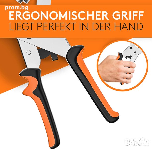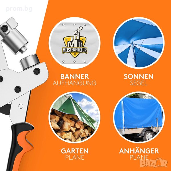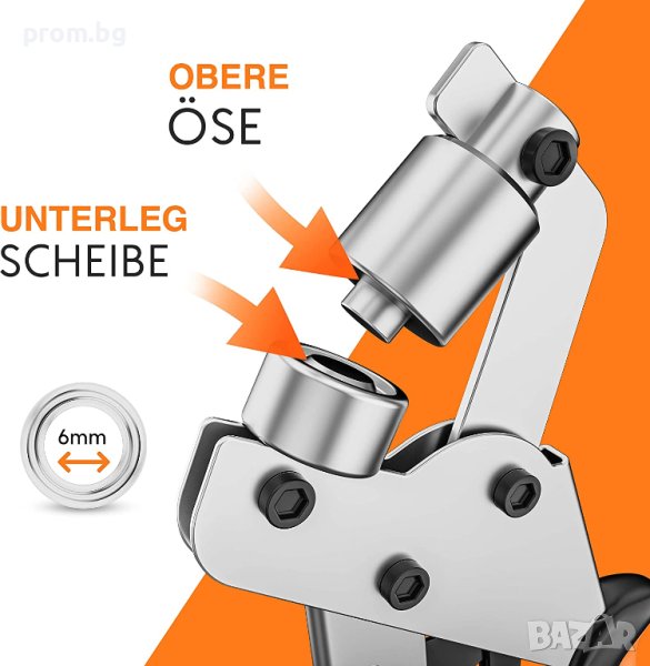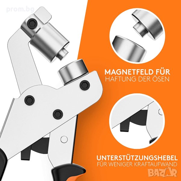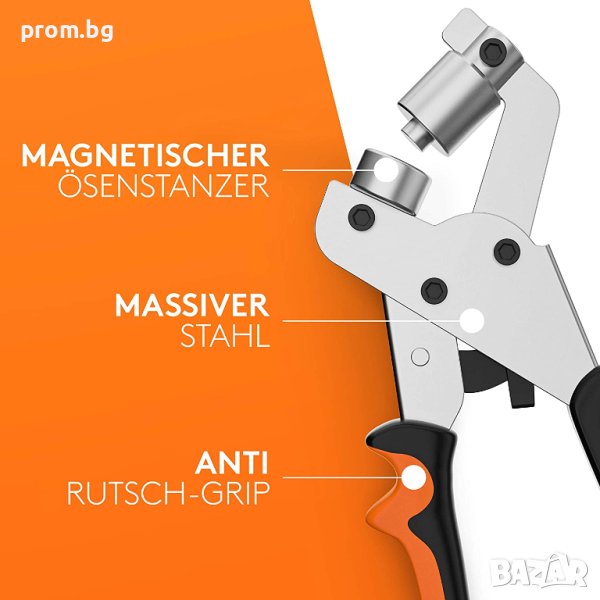Професионални клещи за капси, в комплект със 100 бр. сребристи капси. Внос от Германия. Служат за поставяне на капси в плат, тъкани, брезент и др. С удобна ергономична дръжка. При работа с тях е необходимо минимално усилие, благодарение на иновативната лостова технология. Клещите гарантират безопасна работа. Материал - стомана и висококачествена пластмаса, неплъзгаща се. - клещи с комплект от 100 бр. сребристи капси с диаметър 6 мм;