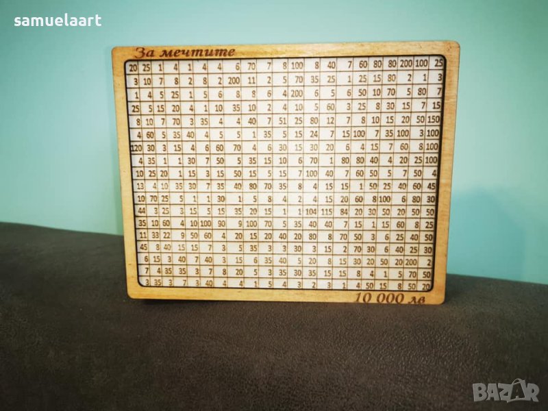 касичка за пари-модел с цел, при всяко пускане на пари се задрасква съответното число! В края всички задраскани суми правят 10 000 лв. С лазерна пирография на текст и име включена в цената! Размери 22/17/7 изработва се по поръчка срок 5 дни!!!На гърба може да се гравират различни картинки -ПРИ ПОРЪЧКА НАПИШЕТЕ КАКВО ИСКАТЕ ДА БЪДЕ ГРАВИРАНО НА ГЪРБА НА КАСИЧКАТА(КАРТИНКАТА Е ОТ ДРУГА ПОРЪЧКА)