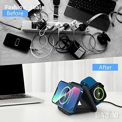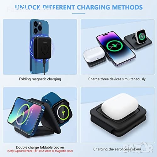 Сгъваемото пътно безжично зарядно устройство е станция за зареждане 3 в 1, която може да зарежда iPhone, iWatch и AirPods едновременно. То има компактен и сгъваем дизайн, което го прави удобна за пътуване зарядна станция. Зарядното устройство се предлага с 18W адаптер и кабел Type-C и има множество сертификати за безопасност със защита от свръхток, свръхнапрежение и свръхзареждане. Безжичното зарядно устройство е съвместимо с iPhone 14/13/12/11/SE/XR/XS/8, Apple Watch Ultra и AirPods 2/3/Pro. Индикаторът за зареждане има различни цветни светлини, показващи състоянието на процеса на зареждане.