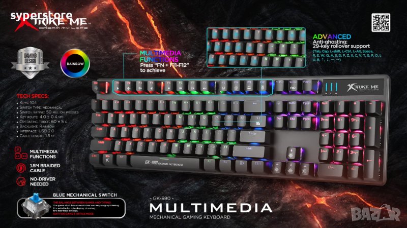 Клавиатура Геймърска USB Xtrike MЕ GK-980 Черна Механична с 7 цвята Подсветка → Обява 40835993