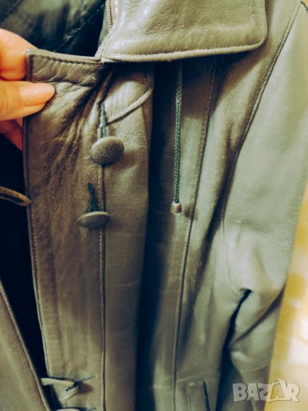 Продава се дълго дамско кожено яке в маслено зелен цвят – изискан, модерен и лесен за съчетаване.