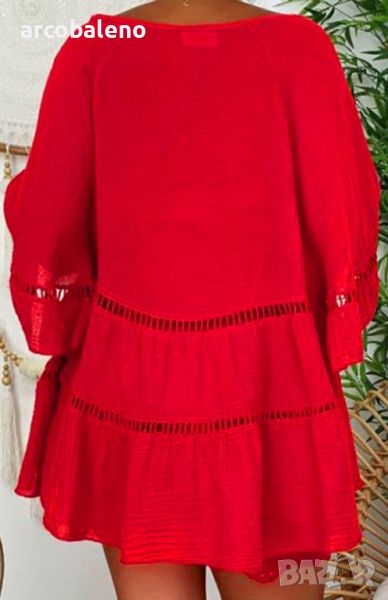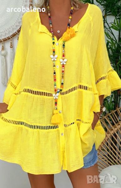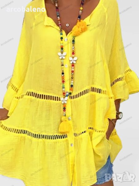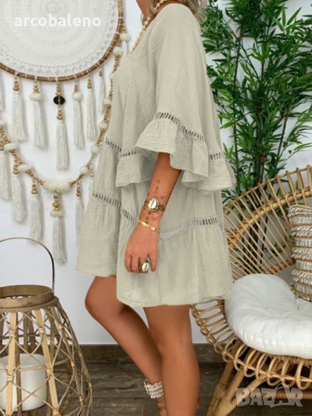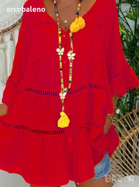 Повдигнете своя небрежен шикозен стил с тази дамска горна рокля от памучно бельо с 3/4 ръкави и V-образно деколте. Свободната кройка и изрязаните копчета добавят нотка елегантност, идеални за ежедневно носене или обличане за специален повод. Изработена от 100% памук, тази рокля е дишаща и удобна, което я прави универсална част за всеки сезон.