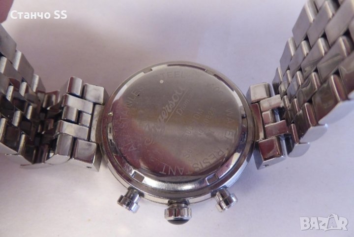Часовника е изработен от неръждаема стомана и е доста солиден...в комплект с оригиналната кутия...Има гар.карта с вписан индефикационен номер...съвпадащ с щампованият номер на часовника...Също така има сертификат за качеството на диамантите както на циферблата така и на самият корпус...Налични са и прешлените за удължаване на верижката...