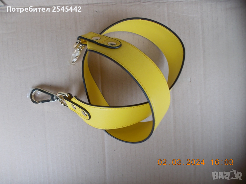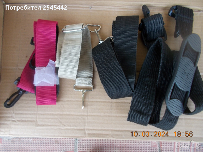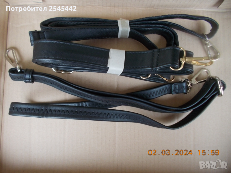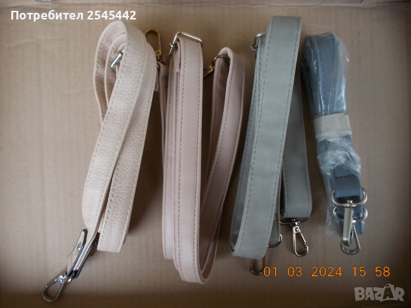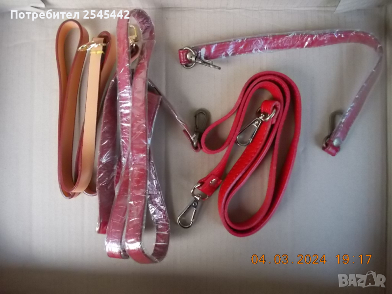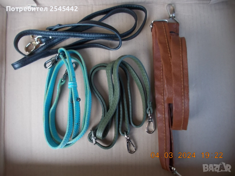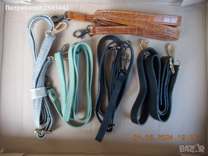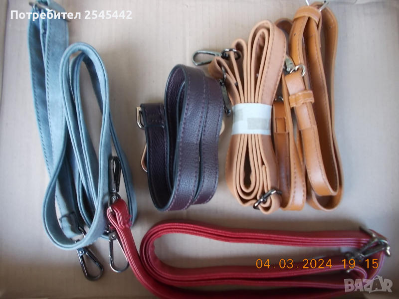 Предлагам различни по цвят, широчина и дължина дръжки за чанти, предимно кожени. Нови. Кожени - 8 лв/ бр. Платнени - 4 лв/ бр.