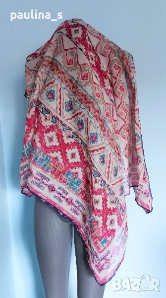 3. Колаж / Разкошен винтидж шал от времето соц-а, индийски, ръчна изработка с високо качество! Материята е много фин и прозрачен памук, може да се носи през всички сезони. Принтът е в малинено червено и лилаво. На живо е хипнотично красив. Размери 102см / 105см. Цената е крайна 39,99лв.