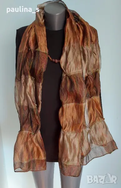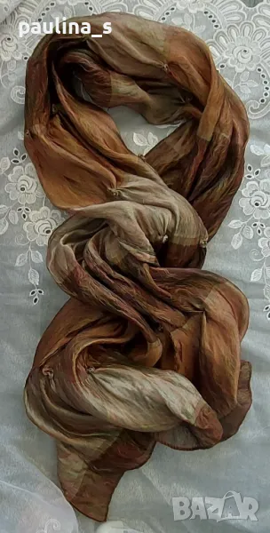2. Колаж / Транслуцентен шал "Rikka", мени си цвета на светлината, коприната е вътре между двата пласта като нишки. Цената е крайна 49,99лв. Размери: 178см / 57см. Ръчна изработка и декорация от шахматно разположени ушити от плата розички с мънисто. Изцяло ръчна изработка, изключително изискан и приковаващ погледите аксесоар. Уникат.