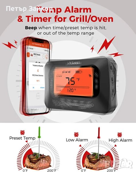 Предварително зададена температура и таймер на USDA: Термометърът за месо за печене на скара има 12 предварително зададени температури и 5 нива на вкус за различни видове храни, препоръчани от USDA, можете да зададете диапазон на висока/ниска температура и таймера или да персонализирате според вашия вкус; Когато времето или температурата бъдат достигнати, термометърът за дълбоко пържене в масло ще алармира